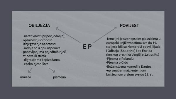 -narativnost (pripovijedanje), opširnost, iscrpnost i izbjegavanje napetosti -radnja se u epu usporava ponavljanjima pojedinih riječi, stihova ili strofa -digresijama i epizodama -epsko pjesništvo
