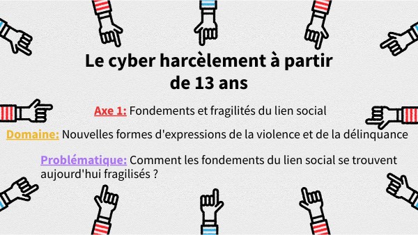 Introduction I. Causes et formes : a) Typologie des causes b) Les différentes formes II. Les conséquences : a) Juridique b) Psychologique pour l’harceleur c) Psychologique pour l’harcelé III. Conseils : a) Pour la victime b) Pour le/les témoin(s) IV. Liens sociaux fragilisés : a) De la famille b) De l’école Témoignage Conclusion