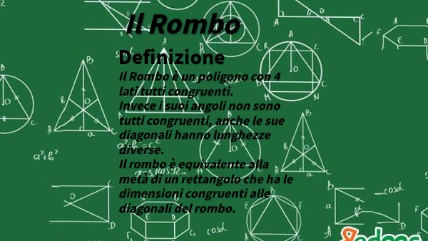 Il Rombo è un poligono con 4 lati tutti congruenti.Invece i suoi angoli non sono tutti congruenti, anche le sue diagonali hanno lunghezze diverse. Il rombo è equivalente alla metà di un rettangolo che ha le dimensioni congruenti alle diagonali del rombo.