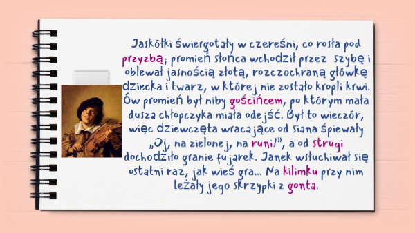 Jaskółki świergotały w czereśni, co rosła pod przyzbą; promień słońca wchodził przez szybę i oblewał jasnością złotą, rozczochraną główkę dziecka i twarz, w której nie zostało kropli krwi. Ów promień był niby gościńcem, po którym mała dusza chłopczyka miała odejść. Był to wieczór, więc dziewczęta wracające od siana śpiewały „Oj, na zielonej, na runi!”, a od strugi dochodziło granie fujarek. Janek wsłuchiwał się ostatni raz, jak wieś gra… Na kilimku przy nim leżały jego skrzypki z gonta.