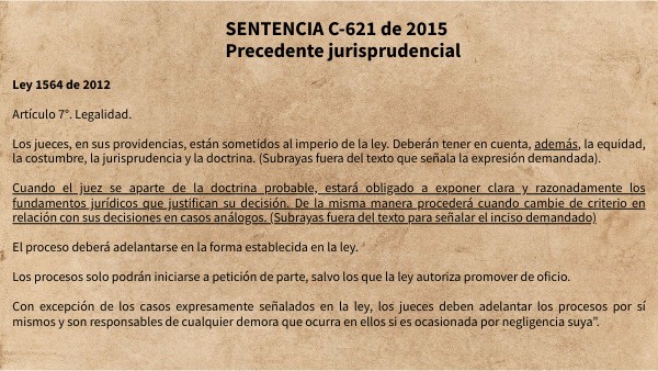 Ley 1564 de 2012 Artículo 7°. Legalidad. Los jueces, en sus providencias, están sometidos al imperio de la ley. Deberán tener en cuenta, además, la equidad, la costumbre, la jurisprudencia y la doctrina. (Subrayas fuera del texto que señala la expresión demandada). Cuando el juez se aparte de la doctrina probable, estará obligado a exponer clara y razonadamente los fundamentos jurídicos que justifican su decisión. De la misma manera procederá cuando cambie de criterio en relación con sus decisiones en casos análogos. (Subrayas fuera del texto para señalar el inciso demandado) El proceso deberá adelantarse en la forma establecida en la ley. Los procesos solo podrán iniciarse a petición de parte, salvo los que la ley autoriza promover de oficio. Con excepción de los casos expresamente señalados en la ley, los jueces deben adelantar los procesos por sí mismos y son responsables de cualquier demora que ocurra en ellos si es ocasionada por negligencia suya”.