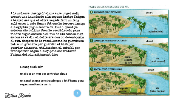 A la primera imatge l' aigua avia pugat molt creant una inundacio a la segona imatge l'aigua a baixat mes que el altra vegada fent un fang molt espes i este fang a fet que la tercera imatge els egiptis pugin sembra cultius i quant ya estaben els cultius feen la recol.leccio para tindre aigua anaven a el riu de els canals aixi es com es va dir el delta era com on desenbocaba el riu. despres de la recol.leccio ho guardaven tot a un granero per guardar el blat per guardar aliments. utilitzaben el catufol per transportar aigua els ejipcis controlaven l'aigua del riu mitjansant dics
