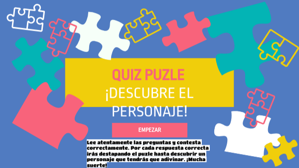 Lee atentamente las preguntas y contesta correctamente. Por cada respuesta correcta irás destapando el puzle hasta descubrir un personaje que tendrás que adivinar. ¡Mucha suerte!