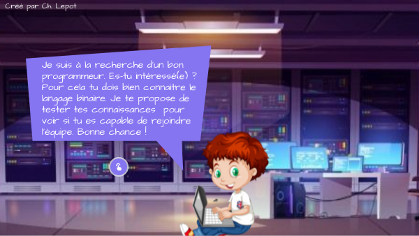 Je suis à la recherche d'un bon programmeur. Es-tu intéressé(e) ? Pour cela tu dois bien connaitre le langage binaire. Je te propose de tester tes connaissances pour voir si tu es capable de rejoindre l'équipe. Bonne chance !