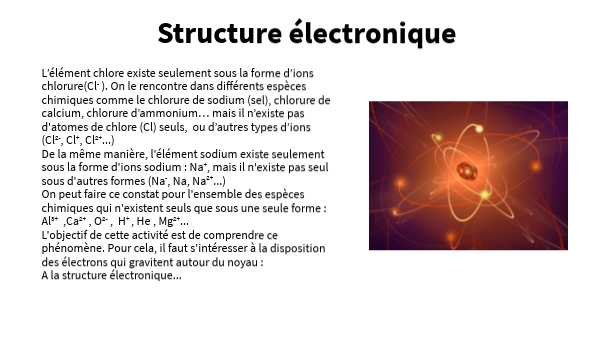 L’élément chlore existe seulement sous la forme d’ions chlorure(Cl- ). On le rencontre dans différents espèces chimiques comme le chlorure de sodium (sel), chlorure de calcium, chlorure d’ammonium… mais il n’existe pas d'atomes de chlore (Cl) seuls, ou d’autres types d’ions (Cl2-, Cl+, Cl2+...) De la même manière, l'élément sodium existe seulement sous la forme d'ions sodium : Na+, mais il n'existe pas seul sous d'autres formes (Na-, Na, Na2+...) On peut faire ce constat pour l'ensemble des espèces chimiques qui n'existent seuls que sous une seule forme : Al3+ ,Ca2+ , O2- , H+ , He , Mg2+... L'objectif de cette activité est de comprendre ce phénomène. Pour cela, il faut s'intéresser à la disposition des électrons qui gravitent autour du noyau : A la structure électronique...