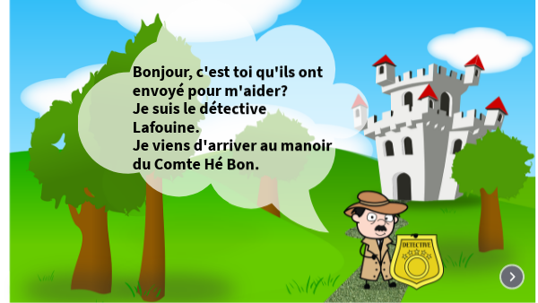 Bonjour, c'est toi qu'ils ont envoyé pour m'aider? Je suis le détective Lafouine. Je viens d'arriver au manoir du Comte Hé Bon.