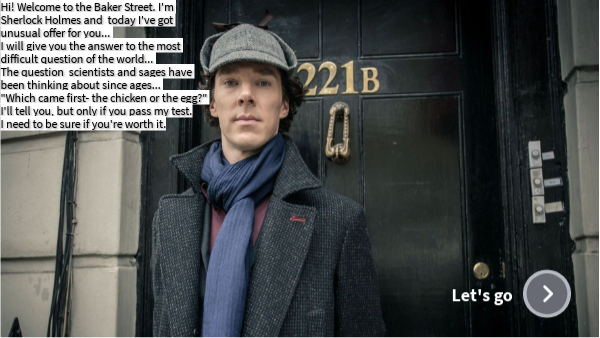 Hi! Welcome to the Baker Street. I'm Sherlock Holmes and today I've got unusual offer for you... I will give you the answer to the most difficult question of the world... The question scientists and sages have been thinking about since ages... "Which came first- the chicken or the egg?" I'll tell you, but only if you pass my test. I need to be sure if you're worth it.