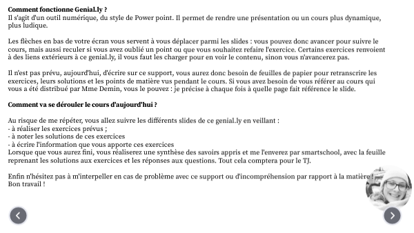 Comment fonctionne Genial.ly ? Il s'agit d'un outil numérique, du style de Power point. Il permet de rendre une présentation ou un cours plus dynamique, plus ludique. Les flèches en bas de votre écran vous servent à vous déplacer parmi les slides : vous pouvez donc avancer pour suivre le cours, mais aussi reculer si vous avez oublié un point ou que vous souhaitez refaire l'exercice. Certains exercices renvoient à des liens extérieurs à ce genial.ly, il vous faut les charger pour en voir le contenu, sinon vous n'avancerez pas. Il n'est pas prévu, aujourd'hui, d'écrire sur ce support, vous aurez donc besoin de feuilles de papier pour retranscrire les exercices, leurs solutions et les points de matière vus pendant le cours. Si vous avez besoin de vous référer au cours qui vous a été distribué par Mme Demin, vous le pouvez : je précise à chaque fois à quelle page fait référence le slide. Comment va se dérouler le cours d'aujourd'hui ? Au risque de me répéter, vous allez suivre les différents slides de ce genial.ly en veillant : - à réaliser les exercices prévus ; - à noter les solutions de ces exercices - à écrire l'information que vous apporte ces exercices Lorsque que vous aurez fini, vous réaliserez une synthèse des savoirs appris et me l'enverez par smartschool, avec la feuille reprenant les solutions aux exercices et les réponses aux questions. Tout cela comptera pour le TJ. Enfin n'hésitez pas à m'interpeller en cas de problème avec ce support ou d'incompréhension par rapport à la matière ! Bon travail !