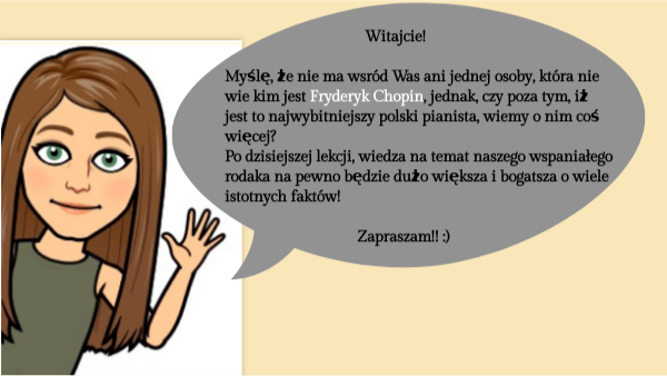 Witajcie! Myślę, że nie ma wsród Was ani jednej osoby, która nie wie kim jest Fryderyk Chopin, jednak, czy poza tym, iż jest to najwybitniejszy polski pianista, wiemy o nim coś więcej? Po dzisiejszej lekcji, wiedza na temat naszego wspaniałego rodaka na pewno będzie dużo większa i bogatsza o wiele istotnych faktów! Zapraszam!! :)