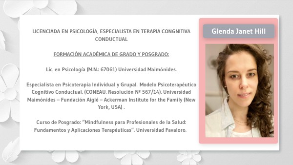 LICENCIADA EN PSICOLOGÍA, ESPECIALISTA EN TERAPIA CONGNITIVA CONDUCTUAL FORMACIÓN ACADÉMICA DE GRADO Y POSGRADO: Lic. en Psicología (M.N.: 67061) Universidad Maimónides.Especialista en Psicoterapia Individual y Grupal. Modelo Psicoterapéutico Cognitivo Conductual. (CONEAU. Resolución Nº 567/14). Universidad Maimónides – Fundación Aiglé – Ackerman Institute for the Family (New York, USA) . Curso de Posgrado: “Mindfulness para Profesionales de la Salud: Fundamentos y Aplicaciones Terapéuticas”. Universidad Favaloro.
