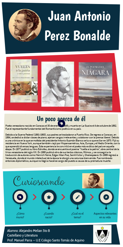 Poeta venezolano nacido en Caracas el 30 de enero de 1846 y muerto en La Guaira el 4 de octubre de 1892. Fue el representante fundamental del Romanticismo poético en su país. Debido a la Guerra Federal (1861-1863), sus padres se trasladaron a Puerto Rico. De regreso a Caracas, en 1864, se dedicó a dictar clases de piano, ejercer cargos irrelevantes y colaborar con la prensa liberal. Debido a una crónica en la que se mofaba del presidente Antonio Guzmán Blanco se tuvo que exiliar en 1870. Fijó su residencia en Nueva York, aunque también viajó por Hispanoamérica, Asia, Europa y el Medio Oriente, con lo que aprendió diversas lenguas. Esta experiencia le convirtió en el poeta más exótico del país en aquella etapa. En 1877 publicó su libro Estrofas, donde se encuentra el poema "Vuelta a la patria", obra central de la lírica venezolana del siglo XIX. En 1880 publicó otro de sus textos clásicos, Ritmos, y se consagró a la traducción de autores como Henrich Heine, Edgar Allan Poe, Saint-Victor y Shakespeare. En 1889 regresó a Venezuela, donde el mundo intelectual de la época le otorgó una calurosa bienvenida. Fue nombrado entonces diplomático, aunque no llegó a hacerse cargo del puesto a causa de su prematura muerte.