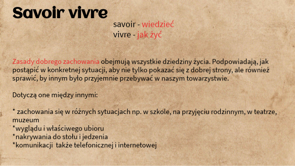 Zasady dobrego zachowania obejmują wszystkie dziedziny życia. Podpowiadają, jak postąpić w konkretnej sytuacji, aby nie tylko pokazać się z dobrej strony, ale również sprawić, by innym było przyjemnie przebywać w naszym towarzystwie. Dotyczą one między innymi: * zachowania się w różnych sytuacjach np. w szkole, na przyjęciu rodzinnym, w teatrze, muzeum*wyglądu i właściwego ubioru*nakrywania do stołu i jedzenia*komunikacji także telefonicznej i internetowej