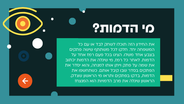 את החידון הזה תוכלו לשחק לבד או עם כל המשפחה יחד. חלקו לכל משתתף שישה פתקים בצבע אחד משלו. הציגו בכל פעם רמז אחד על הדמות. לאחר כל רמז, מי שיגלה את הדמות יכתוב את שמה על פתק וייתן אותו למנחה, והוא יסדר את הפתקים בסדר שבו קיבל אותם. כשתחשפו את הדמות, בדקו בפתקים ותראו מי הראשון שצדק. הראשון שיגלה את מרב הדמויות הוא המנצח!