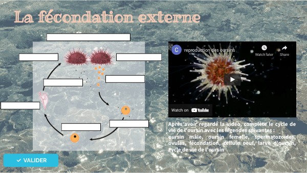 Après avoir regardé la vidéo, complète le cycle de vie de l'oursin avec les légendes suivantes : oursin mâle, oursin femelle, spermatozoïdes, ovules, fécondation, cellule oeuf, larve d'oursin, cycle de vie de l'oursin