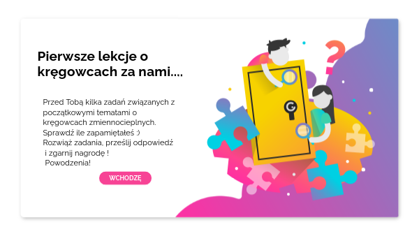 Przed Tobą kilka zadań związanych z początkowymi tematami o kręgowcach zmiennocieplnych. Sprawdź ile zapamiętałeś :)Rozwiąż zadania, prześlij odpowiedź i zgarnij nagrodę ! Powodzenia!