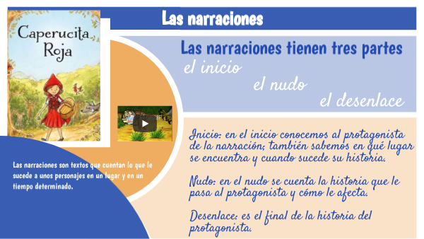 Inicio: en el inicio conocemos al protagonista de la narración; también sabemos en qué lugar se encuentra y cuando sucede su historia. Nudo: en el nudo se cuenta la historia que le pasa al protagonista y cómo le afecta. Desenlace: es el final de la historia del protagonista.