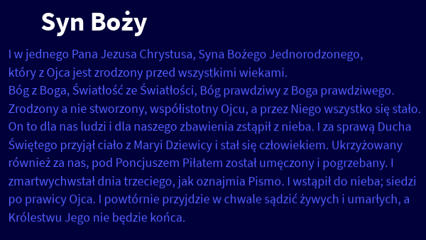 I w jednego Pana Jezusa Chrystusa, Syna Bożego Jednorodzonego, który z Ojca jest zrodzony przed wszystkimi wiekami. Bóg z Boga, Światłość ze Światłości, Bóg prawdziwy z Boga prawdziwego. Zrodzony a nie stworzony, współistotny Ojcu, a przez Niego wszystko się stało. On to dla nas ludzi i dla naszego zbawienia zstąpił z nieba. I za sprawą Ducha Świętego przyjął ciało z Maryi Dziewicy i stał się człowiekiem. Ukrzyżowany również za nas, pod Poncjuszem Piłatem został umęczony i pogrzebany. I zmartwychwstał dnia trzeciego, jak oznajmia Pismo. I wstąpił do nieba; siedzi po prawicy Ojca. I powtórnie przyjdzie w chwale sądzić żywych i umarłych, a Królestwu Jego nie będzie końca.