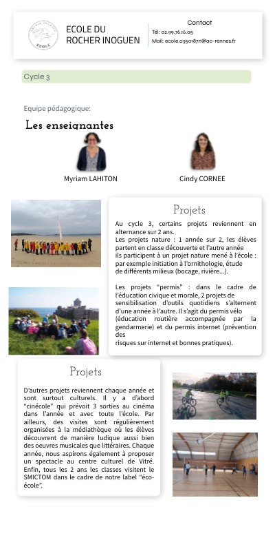 Au cycle 3, certains projets reviennent en alternance sur 2 ans.Les projets nature : 1 année sur 2, les élèves partent en classe découverte et l’autre annéeils participent à un projet nature mené à l’école : par exemple initiation à l’ornithologie, étudede différents milieux (bocage, rivière...).Les projets “permis” : dans le cadre de l’éducation civique et morale, 2 projets desensibilisation d’outils quotidiens s’alternent d’une année à l’autre. Il s’agit du permis vélo(éducation routière accompagnée par la gendarmerie) et du permis internet (prévention desrisques sur internet et bonnes pratiques).