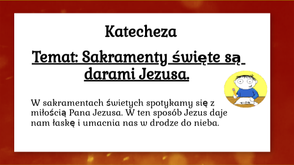 W sakramentach świetych spotykamy się z miłością Pana Jezusa. W ten sposób Jezus daje nam łaskę i umacnia nas w drodze do nieba.