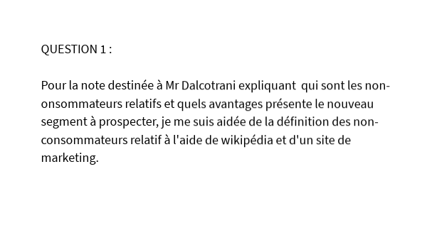 QUESTION 1 : Pour la note destinée à Mr Dalcotrani expliquant qui sont les non- onsommateurs relatifs et quels avantages présente le nouveau segment à prospecter, je me suis aidée de la définition des non-consommateurs relatif à l'aide de wikipédia et d'un site de marketing.
