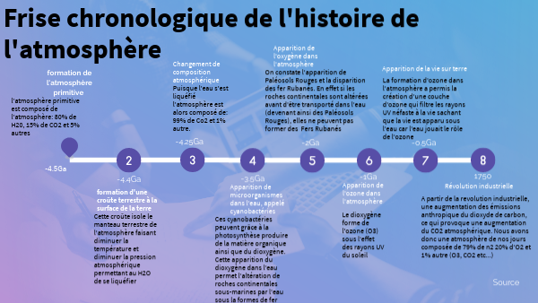 A partir de la revolution industrielle, une augmentation des émissions anthropique du dioxyde de carbon, ce qui provoque une augmentation du CO2 atmosphérique. Nous avons donc une atmosphère de nos jours composée de 79% de n2 20% d'O2 et 1% autre (O3, CO2 etc...)