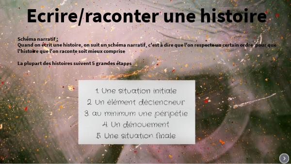 Schéma narratif : Quand on écrit une histoire, on suit un schéma narratif, c'est à dire que l'on respecte un certain ordre pour que l'histoire que l'on raconte soit mieux comprise La plupart des histoires suivent 5 grandes étapes