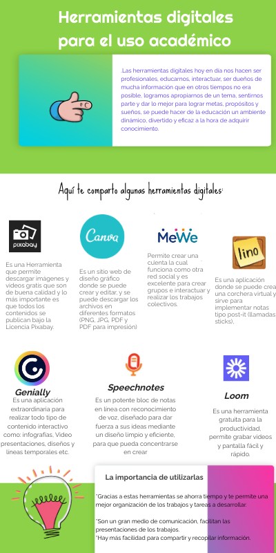 .Las herramientas digitales hoy en día nos hacen ser profesionales, educarnos, interactuar, ser dueños de mucha información que en otros tiempos no era posible, logramos apropiarnos de un tema, sentirnos parte y dar lo mejor para lograr metas, propósitos y sueños, se puede hacer de la educación un ambiente dinámico, divertido y eficaz a la hora de adquirir conocimiento.