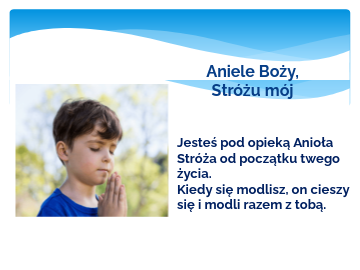 Anioł jest zawsze przy tobie. Opiekuje się tobą w ciągu dnia: gdy jesteś w domu, w szkole, również w trakcie zabawy. Przypomina, byś był pracowity i ostrożny.