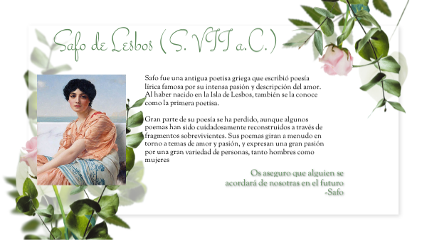 Safo fue una antigua poetisa griega que escribió poesía lírica famosa por su intensa pasión y descripción del amor. Al haber nacido en la Isla de Lesbos, también se la conoce como la primera poetisa. Gran parte de su poesía se ha perdido, aunque algunos poemas han sido cuidadosamente reconstruidos a través de fragmentos sobrevivientes. Sus poemas giran a menudo en torno a temas de amor y pasión, y expresan una gran pasión por una gran variedad de personas, tanto hombres como mujeres
