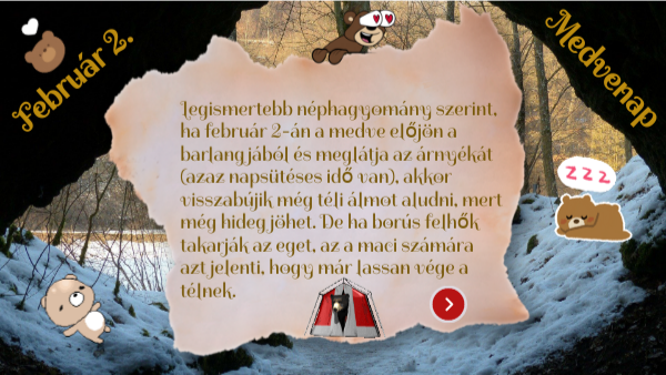 Legismertebb néphagyomány szerint, ha február 2-án a medve előjön a barlangjából és meglátja az árnyékát (azaz napsütéses idő van), akkor visszabújik még téli álmot aludni, mert még hideg jöhet. De ha borús felhők takarják az eget, az a maci számára azt jelenti, hogy már lassan vége a télnek.