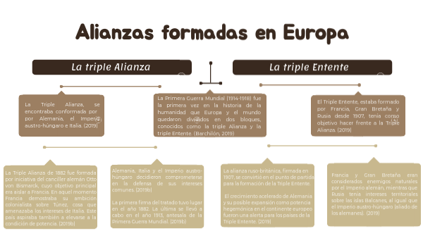 La Triple Alianza de 1882 fue formada por iniciativa del canciller alemán Otto von Bismarck, cuyo objetivo principal era aislar a Francia. En aquel momento Francia demostraba su ambición colonialista sobre Túnez, cosa que amenazaba los intereses de Italia. Este país aspiraba también a elevarse a la condición de potencia. (2019b)