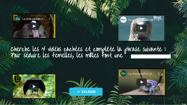 Cherche les 4 vidéos cachées et complète la phrase suivante : Pour séduire les femelles, les mâles font une