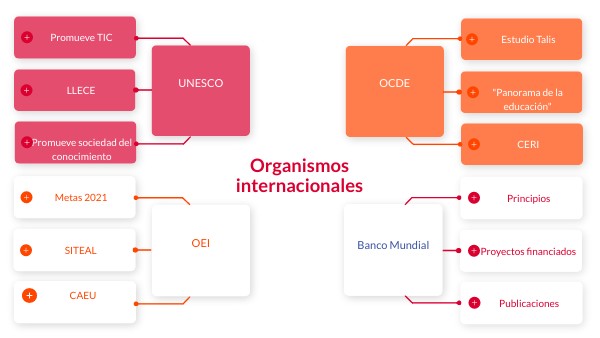 Integra algunas de las actividades específicas que realizan UNESCO, OCDE, OEI y Banco Mundial en materia educativa.