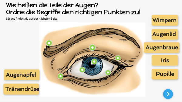 Wie heißen die Teile der Augen? Ordne die Begriffe den richtigen Punkten zu!