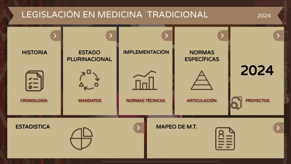 2013 - 19 /12/ Ley 459 de Medicina Tradicional Ancestral Bolivia. 2013 - 30/12 LEY Nº 475 DE PRESTACIONES SERVICIOS DE SALUD INTEGRAL DEL ESTADO PLURINACIONAL DE BOLIVIA 2015-01/07 -Reglamento a la Ley de Medicina Tradicional Ancestral Boliviana, DS Nº 2436