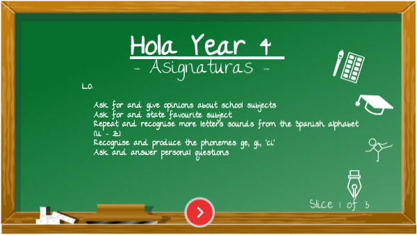 - Ask for and give opinions about school subjectsAsk for and state favourite subject.Repeat and recognise more letters sounds from the Spanish alphabet (U - Z).Recognise and produce the phonemes ge, gi, ‘ci’Ask and answer personal questions