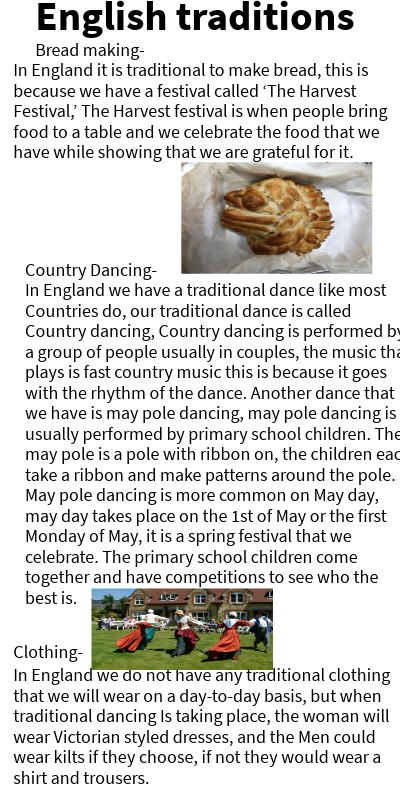 In England it is traditional to make bread, this is because we have a festival called ‘The Harvest Festival,’ The Harvest festival is when people bring food to a table and we celebrate the food that we have while showing that we are grateful for it.