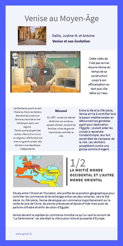 Cette vidéo de C'est pas sorcier résume Venise du temps de sa construction jusqu'à son officialisation en tant que ville bâtie sur l'eau.