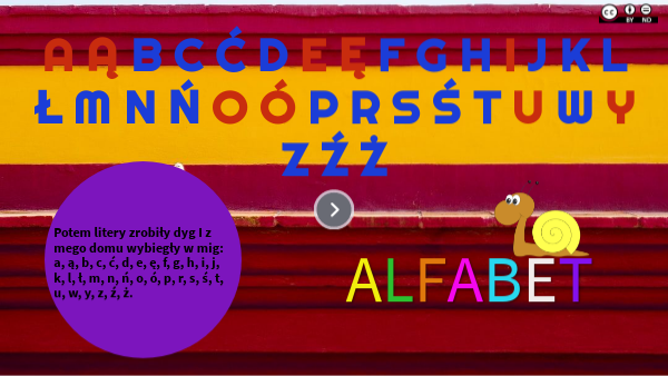 Potem litery zrobiły dyg I z mego domu wybiegły w mig: a, ą, b, c, ć, d, e, ę, f, g, h, i, j, k, l, ł, m, n, ń, o, ó, p, r, s, ś, t, u, w, y, z, ź, ż.