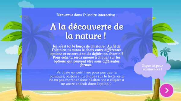 Ici , c'est toi le héros de l'histoire ! Au fil de l'histoire, tu auras le choix entre différentes options et ce sera à toi de défnir ton chemin !! Pour cela, tu seras amené à cliquer sur les options, qui peuvent être sous différentes formes. PS: Juste un petit truc pour pas que tu paniques, parfois si tu cliques sur le texte, cela ne va pas marcher donc hésites pas à cliquer à un autre endroit dans l'option ;)