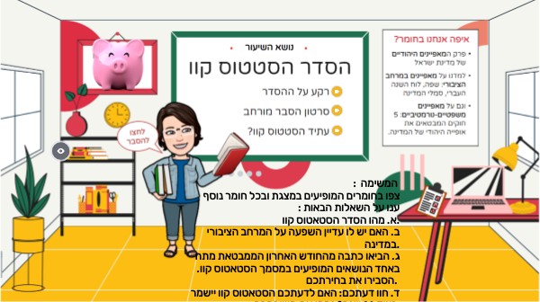 : המשימה צפו בחומרים המופיעים במצגת ובכל חומר נוסף : ענו על השאלות הבאות א. מהו הסדר הסטאטוס קוו. ב. האם יש לו עדיין השפעה על המרחב הציבורי במדינה. ג. הביאו כתבה מהחודש האחרון המבטאת מתח באחד הנושאים המופיעים במסמך הסטאטוס קוו. הסבירו את בחירתכם. ד. חוו דעתכם: האם לדעתכם הסטאטוס קוו יישמר בעוד 20 שנה? נמקו את תשובתכם