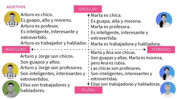 Arturo y Jorge son chicos. Son guapos y altos. Arturo y Jorge son profesores. Son inteligentes, interesantes y extrovertidos. Ellos son trabajadores y habladores.