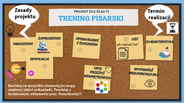Naciskaj na wszystkie elementy,bo mogą zawierać jakieś wskazówki. Pamiętaj o terminowym oddawaniu prac. Powodzenia!!!