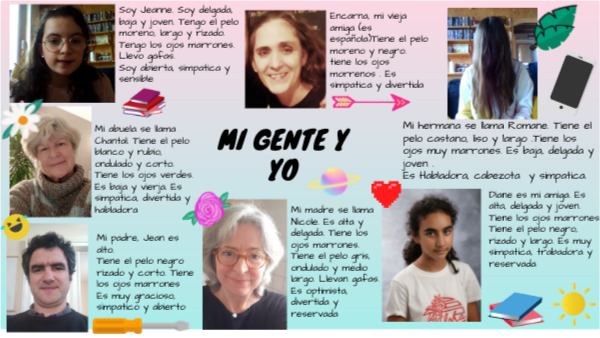 Soy Jeanne. Soy delgada, baja y joven. Tengo el pelo moreno, largo y rizado. Tengo los ojos marrones. Llevo gafas. Soy abierta, simpatica y sensible