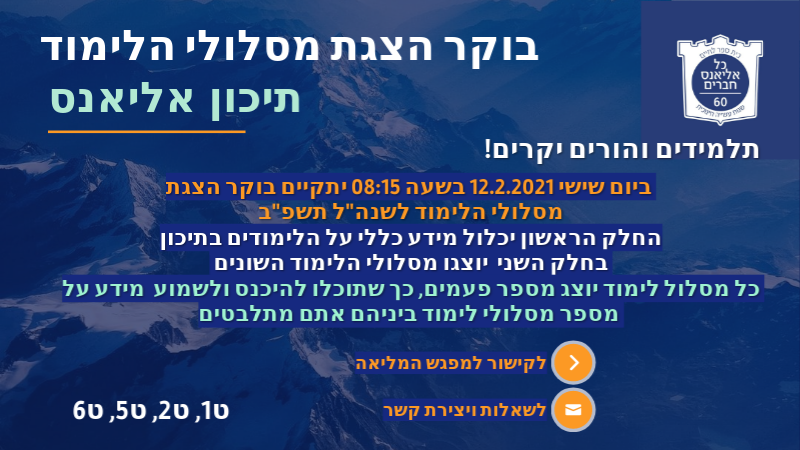 ביום שישי 12.2.2021 בשעה 08:15 יתקיים בוקר הצגת מסלולי הלימוד לשנה"ל תשפ"ב החלק הראשון יכלול מידע כללי על הלימודים בתיכון בחלק השני יוצגו מסלולי הלימוד השונים כל מסלול לימוד יוצג מספר פעמים, כך שתוכלו להיכנס ולשמוע מידע על מספר מסלולי לימוד ביניהם אתם מתלבטים