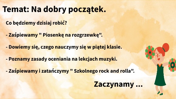 Co będziemy dzisiaj robić? - Zaśpiewamy " Piosenkę na rozgrzewkę". - Dowiemy się, czego nauczymy się w piątej klasie. - Poznamy zasady oceniania na lekcjach muzyki. - Zaśpiewamy i zatańczymy " Szkolnego rock and rolla".