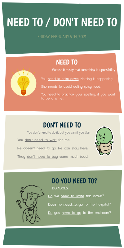 Do we need to write this down? Does he need to go to the hospital? Do you need to go to the restroom?