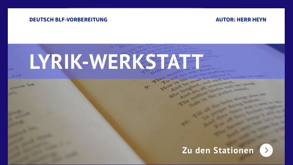 Dieses Format soll dazu dienen, euch mit eurem individuellen Tempo und Vorwissen an Lyrik heranzuführen. Es soll euch kleinschrittig durch die Aspekte des Aufbaus einer Interpretation lyrischer Texte leiten. Ihr entscheidet, in welcher Reihenfolge und mit welchem Schwierigkeitsgrad ihr die folgenden Stationen bearbeitet.
