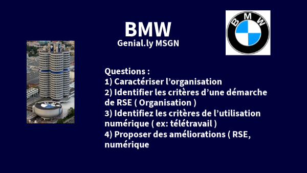 Questions : 1) Caractériser l’organisation 2) Identifier les critères d’une démarche de RSE ( Organisation ) 3) Identifiez les critères de l’utilisation numérique ( ex: télétravail ) 4) Proposer des améliorations ( RSE, numérique