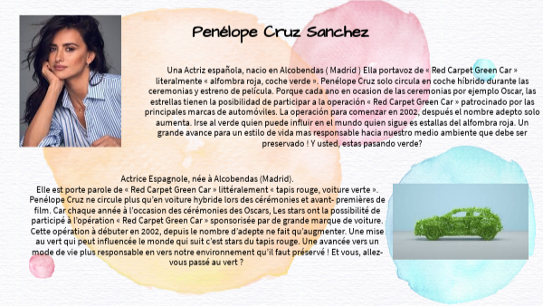 Una Actriz española, nacio en Alcobendas ( Madrid ) Ella portavoz de « Red Carpet Green Car » literalmente « alfombra roja, coche verde ». Penélope Cruz solo circula en coche híbrido durante las ceremonias y estreno de película. Porque cada ano en ocasion de las ceremonias por ejemplo Oscar, las estrellas tienen la posibilidad de participar a la operación « Red Carpet Green Car » patrocinado por las principales marcas de automóviles. La operación para comenzar en 2002, después el nombre adepto solo aumenta. Irse al verde quien puede influir en el mundo quien sigue es estallas del alfombra roja. Un grande avance para un estilo de vida mas responsable hacia nuestro medio ambiente que debe ser preservado ! Y usted, estas pasando verde?